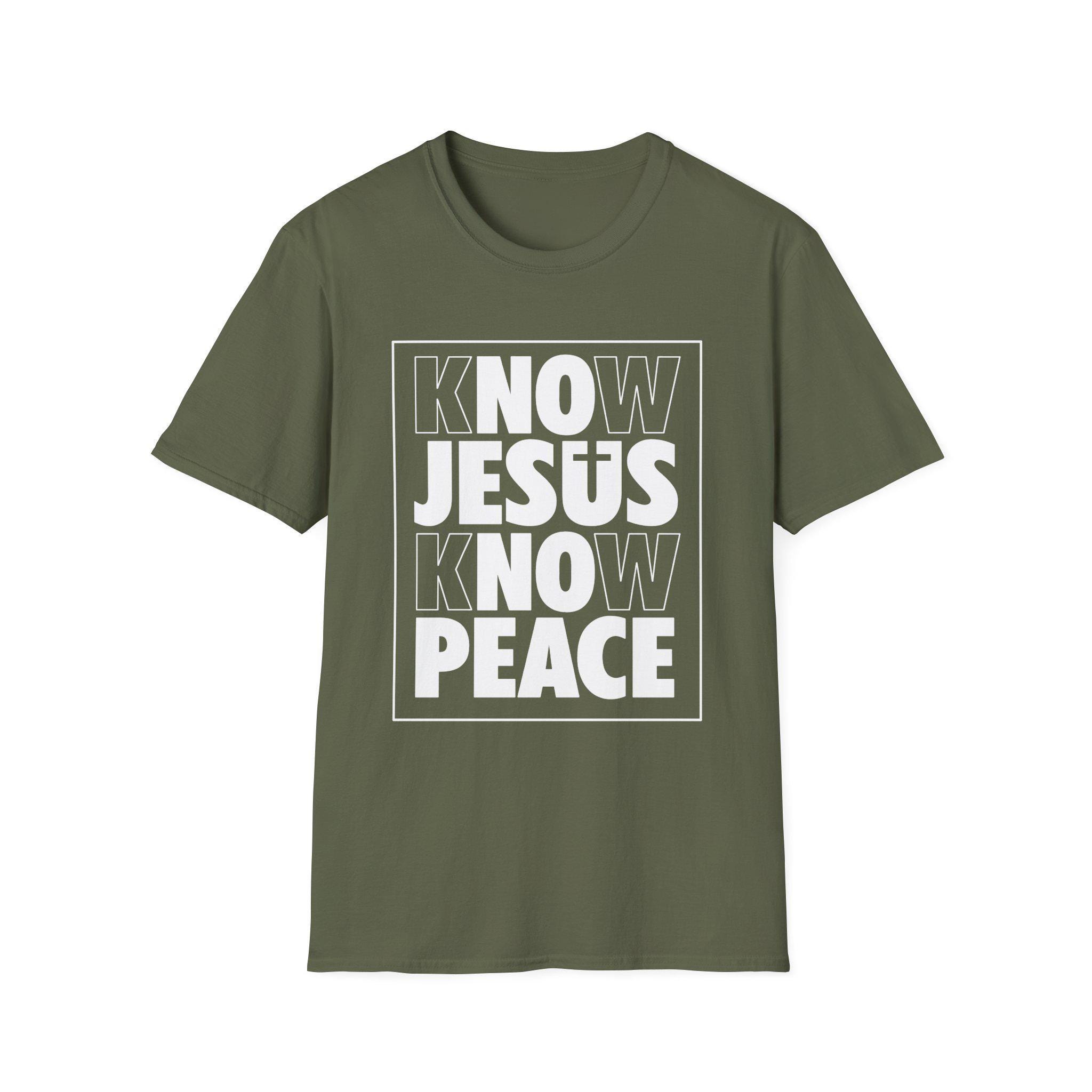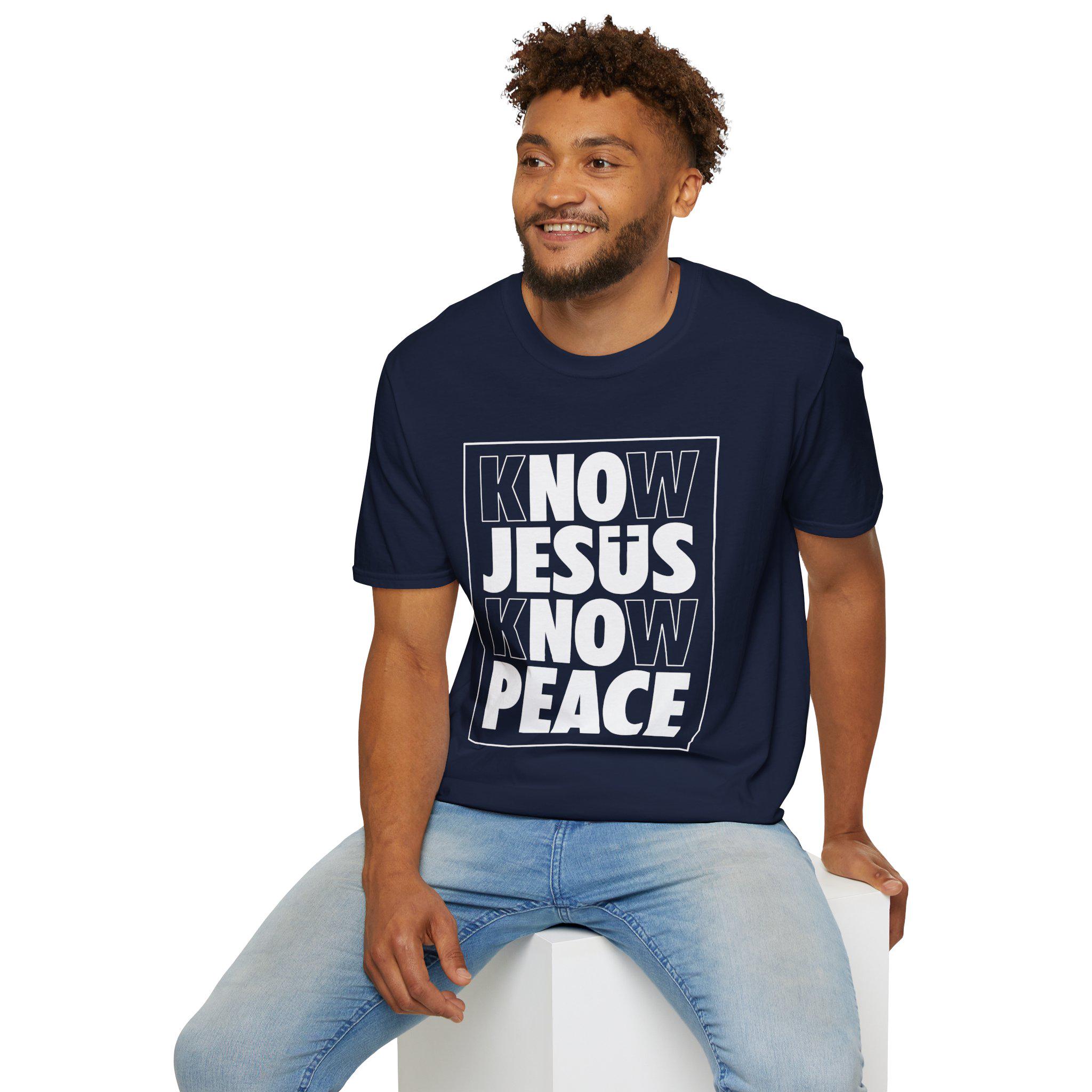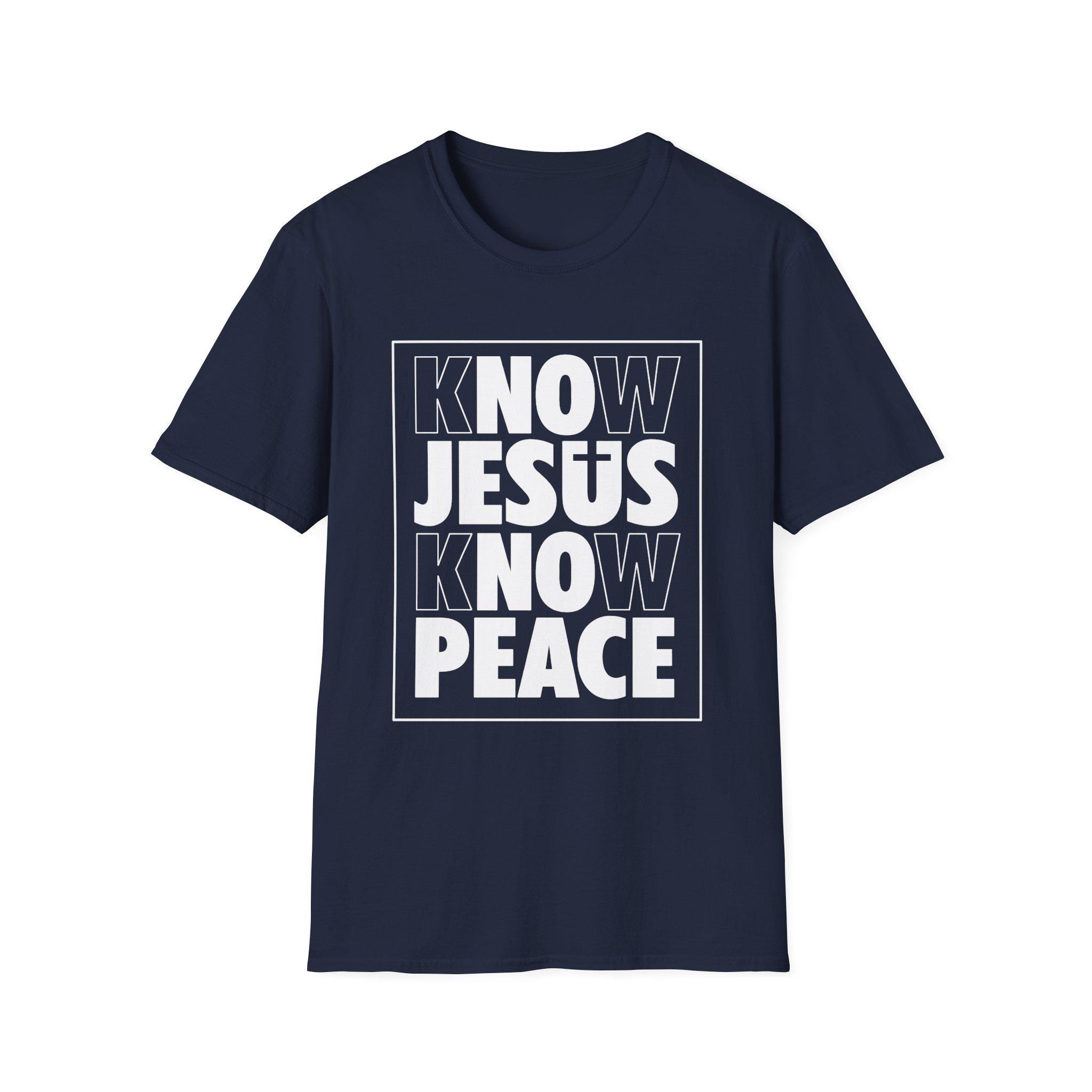Soft, simple, and bold — this crewneck tee says what matters without shouting. The clean black shirt features a strong white boxed design reading “KNOW JESUS KNOW PEACE,” a compact statement piece that sits confidently on the chest. The lightweight, ring-spun cotton feels smooth against skin and drapes in a classic fit that moves easily from church gatherings to neighborhood outreach. Wear it layered under a jacket or alone during warm days; the high-elastic ribbed collar and shoulder tape keep the silhouette crisp wash after wash. For people who carry their faith plainly and with quiet strength, this shirt blends durable everyday comfort with a direct message of calm and conviction.