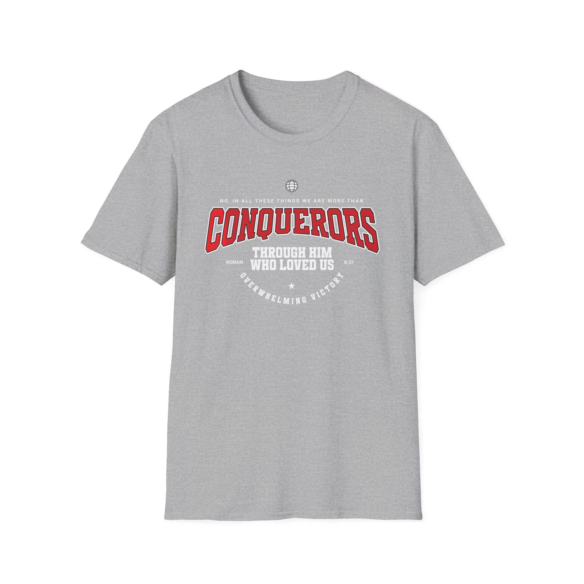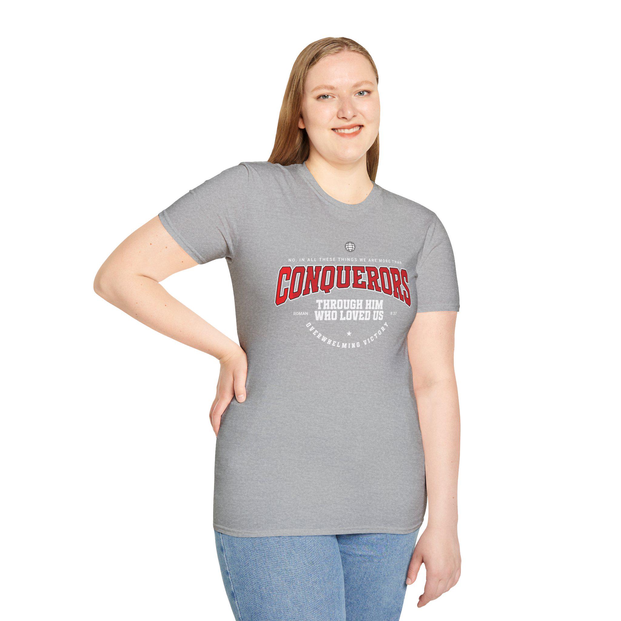 This lightweight crew-neck tee carries a bold, vintage-inspired graphic that reads “Conquerors — through him who loved us,” laid out like an old-school collegiate crest. It feels lived-in from the first wear: soft ring-spun cotton hugs the shoulders, tubular knit keeps the silhouette clean, and a ribbed collar holds its shape. Wear it to church small groups, faith-led runs, or casual meetups where quiet confidence matters. The design sits high on the chest for easy layering under jackets or over long-sleeve tees, and the restrained color palette makes the message stand out without shouting. It’s a simple, faithful statement shirt made to be worn often and kept close.